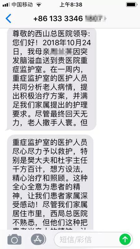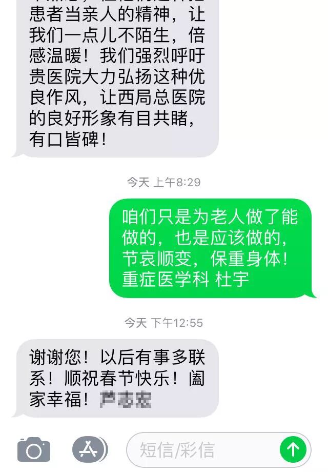 今天,重症医学科收到老人儿子的这条拜年短信,给科室医护人员拜年的同时,也感谢他们对老人住院期间的救治和关心,感激他们对生命的敬畏,对患者的无私,感恩他们以心为灯,做生命的守护天使。